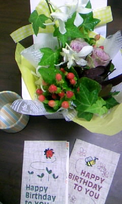 ゆんには、0時に、カードとカップと花を。おチビには、今朝、カードをもらいました。ありがとう。